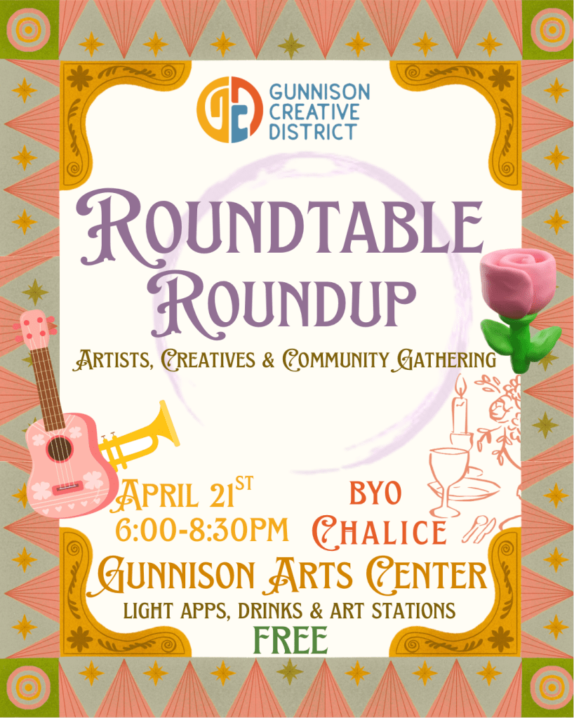 Join the Gunnison Creative District for Roundtable Roundups. These free fun events involve Roundtable dialogue, art making, feasting and fostering collaboration.